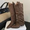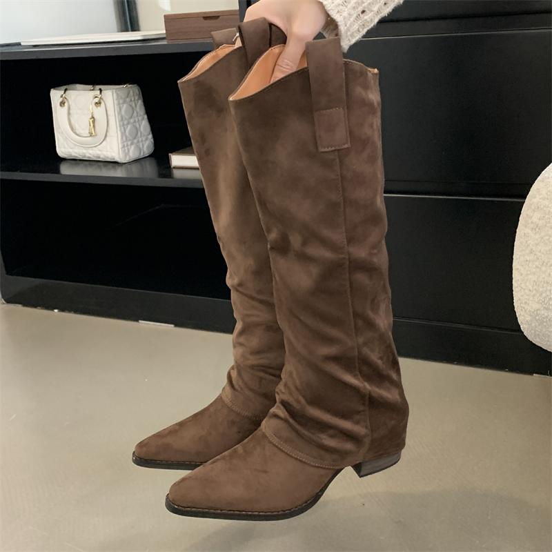 Eilyken Autumn Winter Punk Retro Woman Knee High top Pleated Pointed Toe Long Booties Square Low Heels