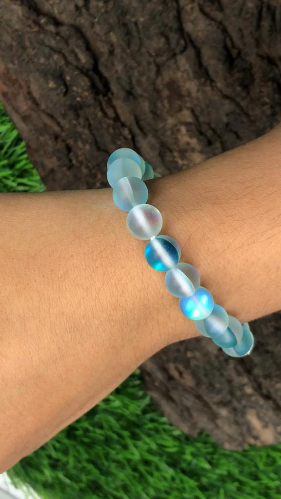 Náramek z korálků 8mm Přírodní Matný Aura Křemen 7.5" Ručně vyráběný Aqua Modrý Matný Pružný Unisex Dárek RBB-86