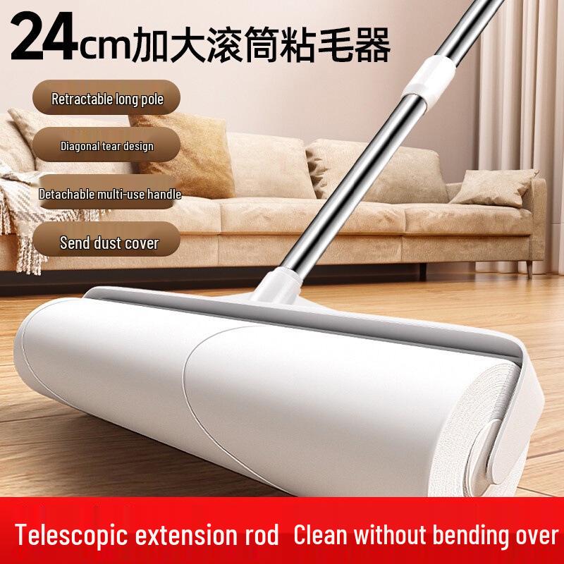 Long Handle Lint Roller with Large Sticky Brush for Bed, Floor, and Hair Cleanup - Tear-Off Paper Replacement Included.