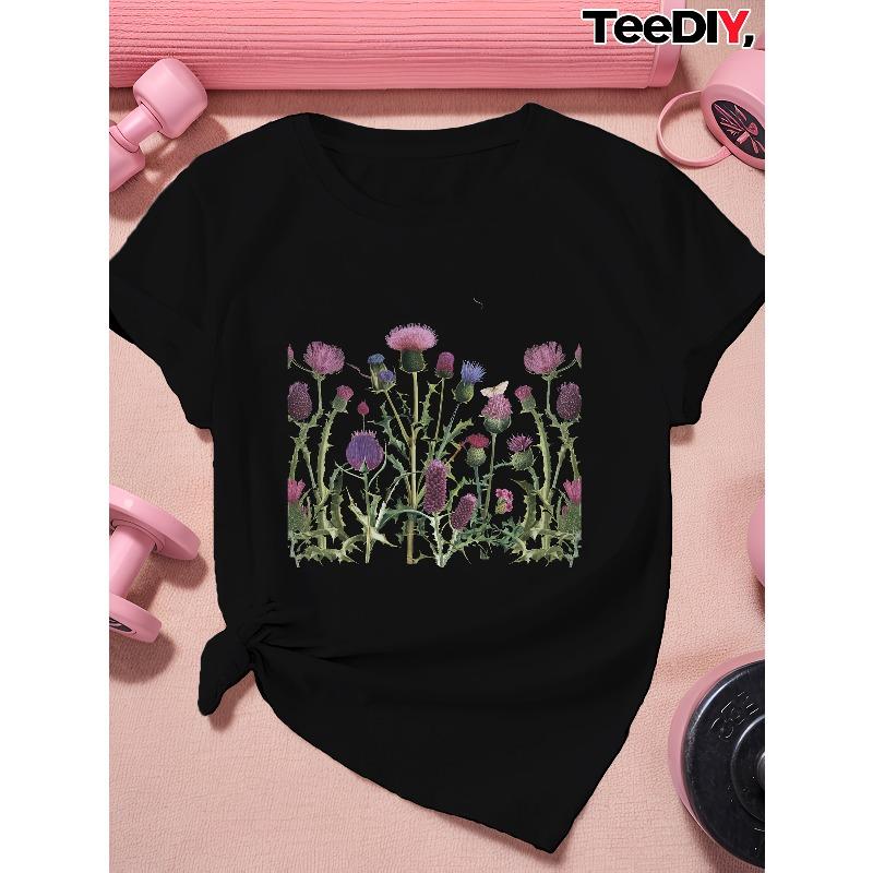 Women Sports Short Sleeve T-Shirt Thistle Botanical Garden Illustration Casual Sports Top
