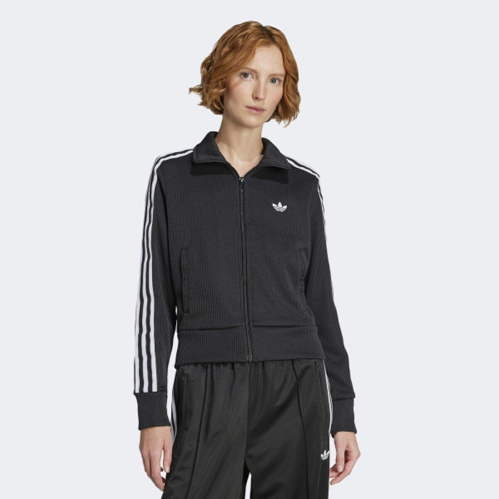 The Adidas JY2613 Goyang Starfield ABC Mart Women's Jersey Jacket Track Top Knit features a regular fit and a short length design, with a high neck and long sleeves. It has a full-length zipper in the front and stands out with its unique Adicolor line designed for women. Made from recycled polyester material, it is environmentally conscious. The color is offered in Charcoal.