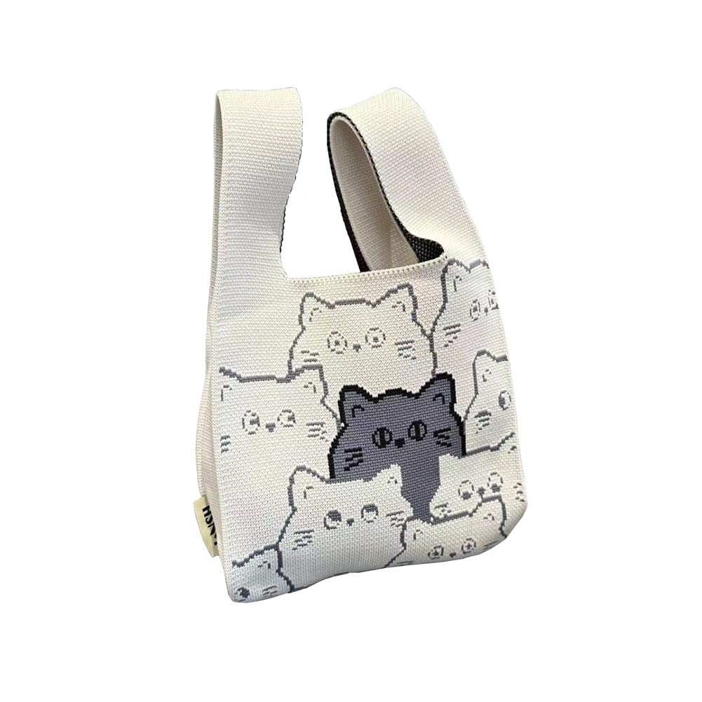 Huimei Knit Bag, Knit Tote Bag, Women's Mini Bag, Handbag with Cat Print, Cute, Compact, Lightweight, Soft, Casual, Sub-Bag (White)