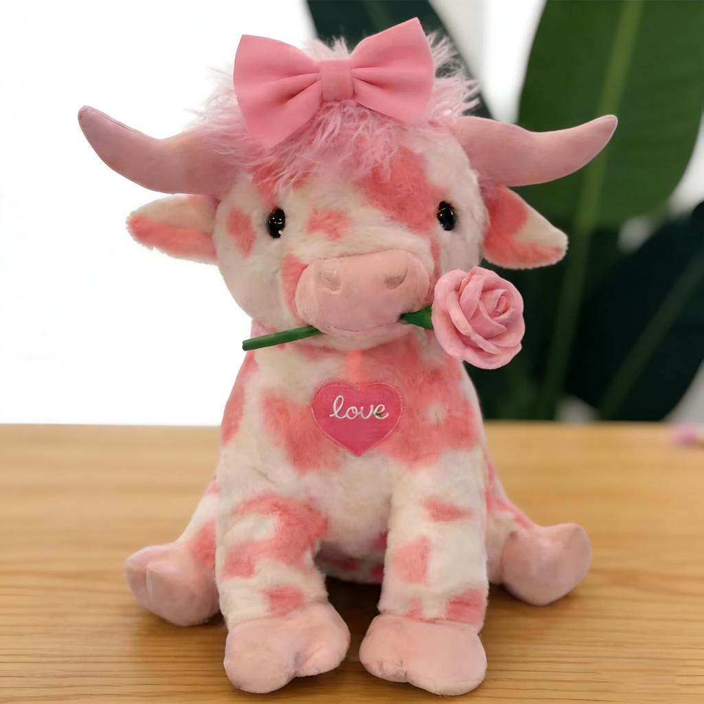 Pink Cow Plush Toy with Heart Embroidery and Rose Cute Stuffed Animal Gift for Christmas or Soft Plush Toy Decoration, Girls, Birthday,