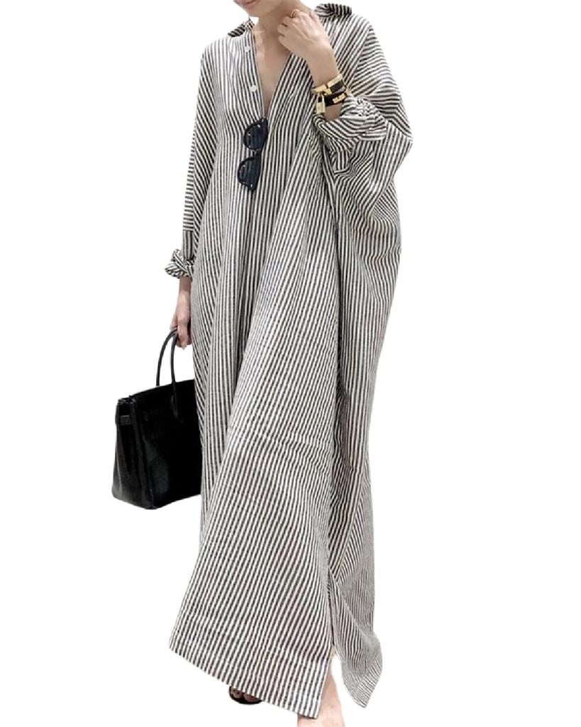 This shirt dress has a relaxed silhouette and is cute and mature. The drop shoulder design and roomy fit make it a great piece to complete a trendy and stylish outfit. It comes in two colors: a black base with thin stripes and a white base with wide stripes.