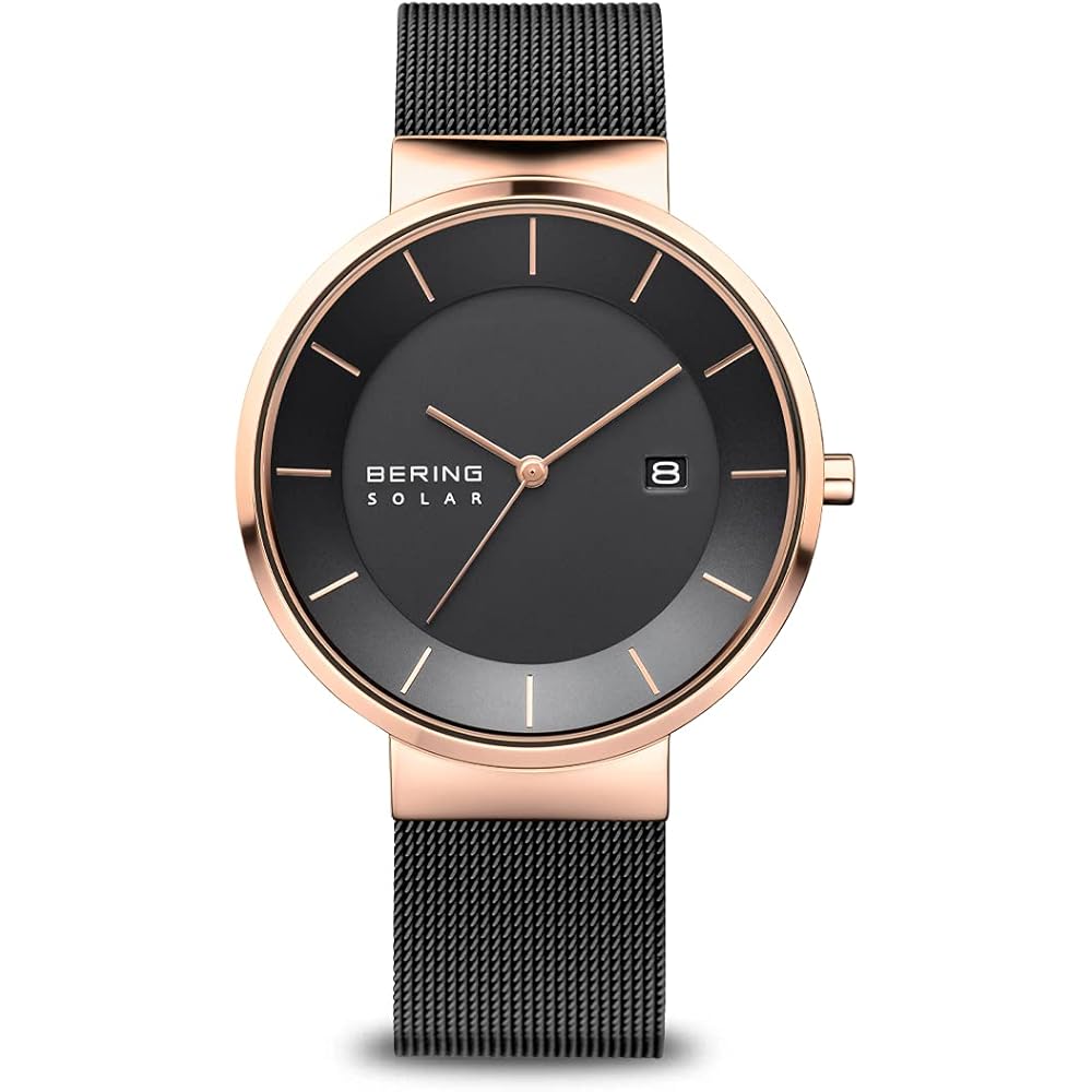 BERING Solar Watch for Men and Women (Unisex) Black and Rose Gold Stainless Steel with Mesh Strap and Sapphire Crystal (Product Number: 14639-166) Off