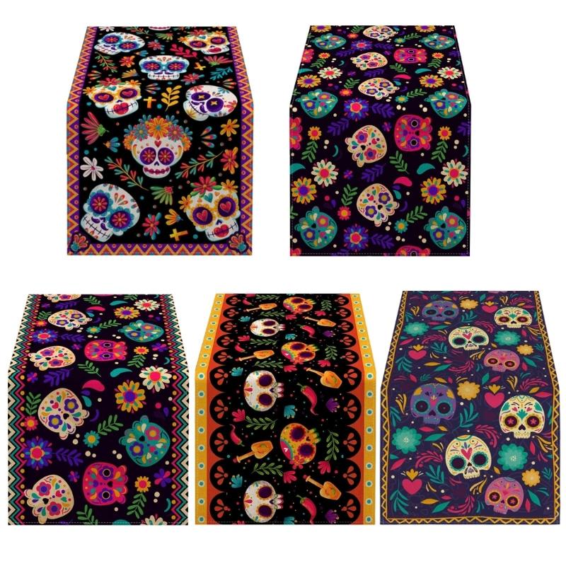 Horror Halloween Skull Table Runner Ethnic Mexico Flower Table Runner Day of The Dead Kitchen Dining Tablecloth Table