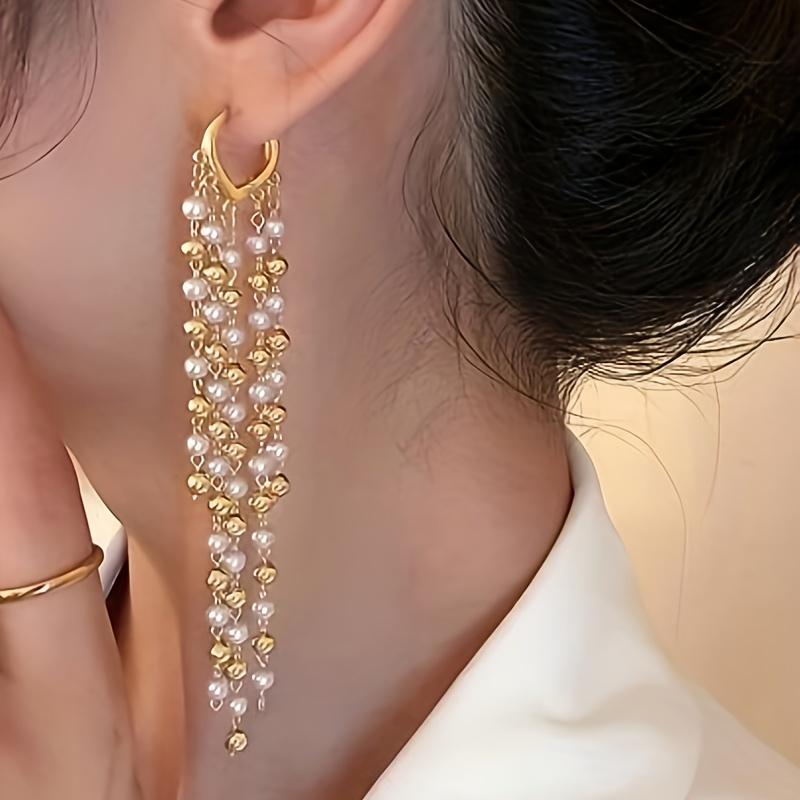 1Pair of Long Women's Fashion Pendant Earrings, French Temperament Elegant Style Imitation Pearl Fringed Pendant