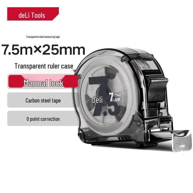 Deli 7.5m Transparent Case Carbon Steel Tape Measure CN plug (adapter included)