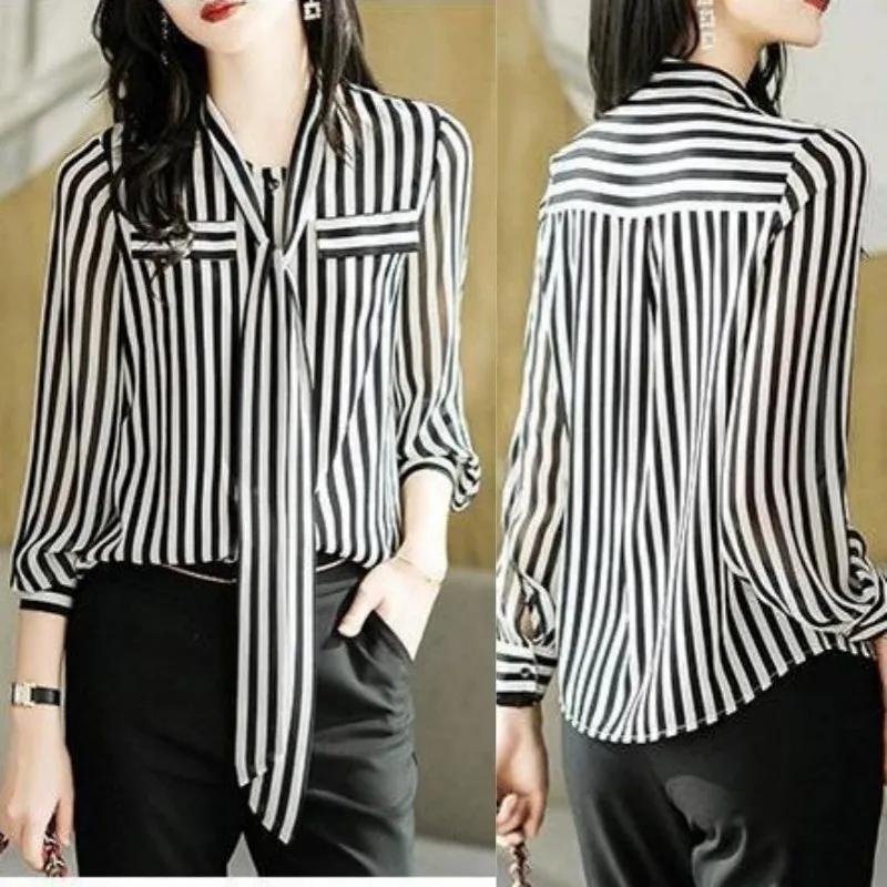 Women's Spring/Fall Bow-Front Blouse Lightweight Striped Long-Sleeve Shirt French-Style Shirt Design
