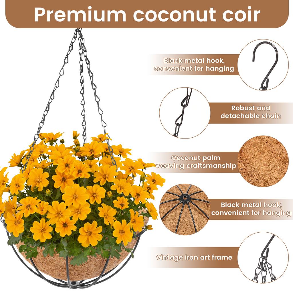 4Pcs 10 Inch Hanging Flower Basket Outdoor Coco Liner Round Hanging Flower Pot with Chain and Hook Metal Plant Basket for Garden