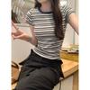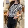 Contrast Striped Right Shoulder Short-sleeved T-shirt for Women Summer New Slim Fit Round Neck Short Top for Small People