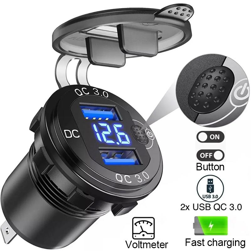 Quick Charger Aluminum Qc3.0 Dual Usb Car Charger With Switch Button Led Voltage Display For 12V/24V Cars Boats Motorcycle