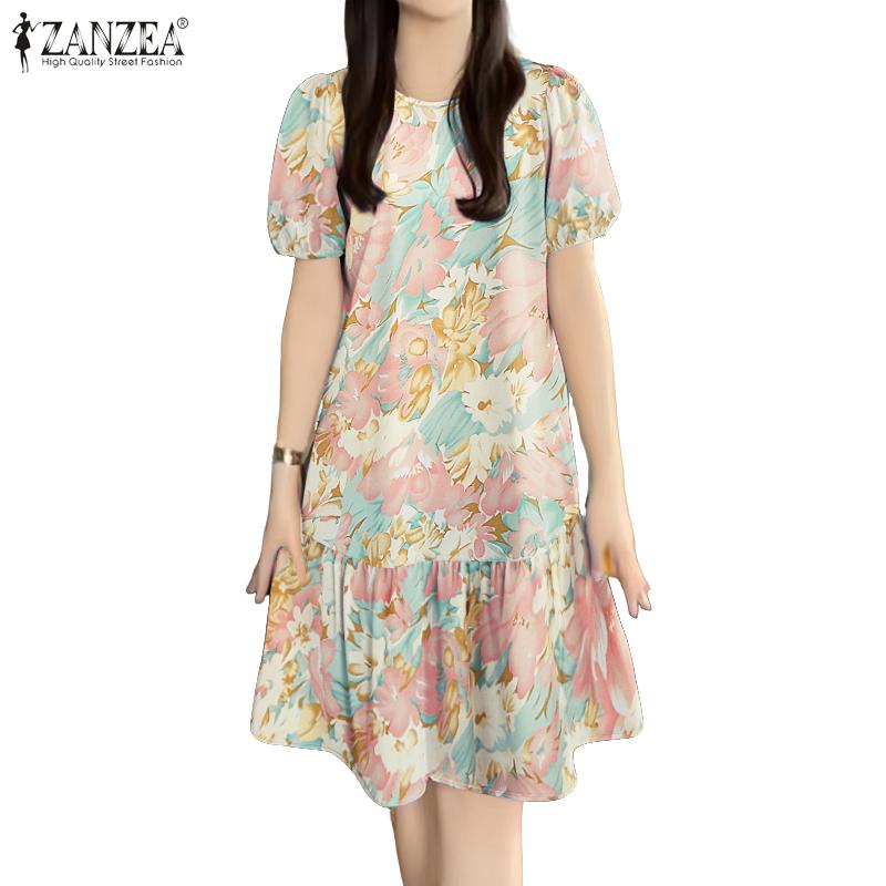 ZANZEA Dámské letní ležérní šaty s kulatým výstřihem a krátkým rukávem s květinovým vzorem
