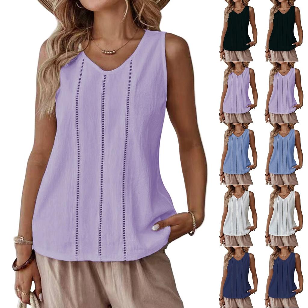 Women's Color Lace Hollow Sleeveless Cotton And Linen Casual Tank Top
