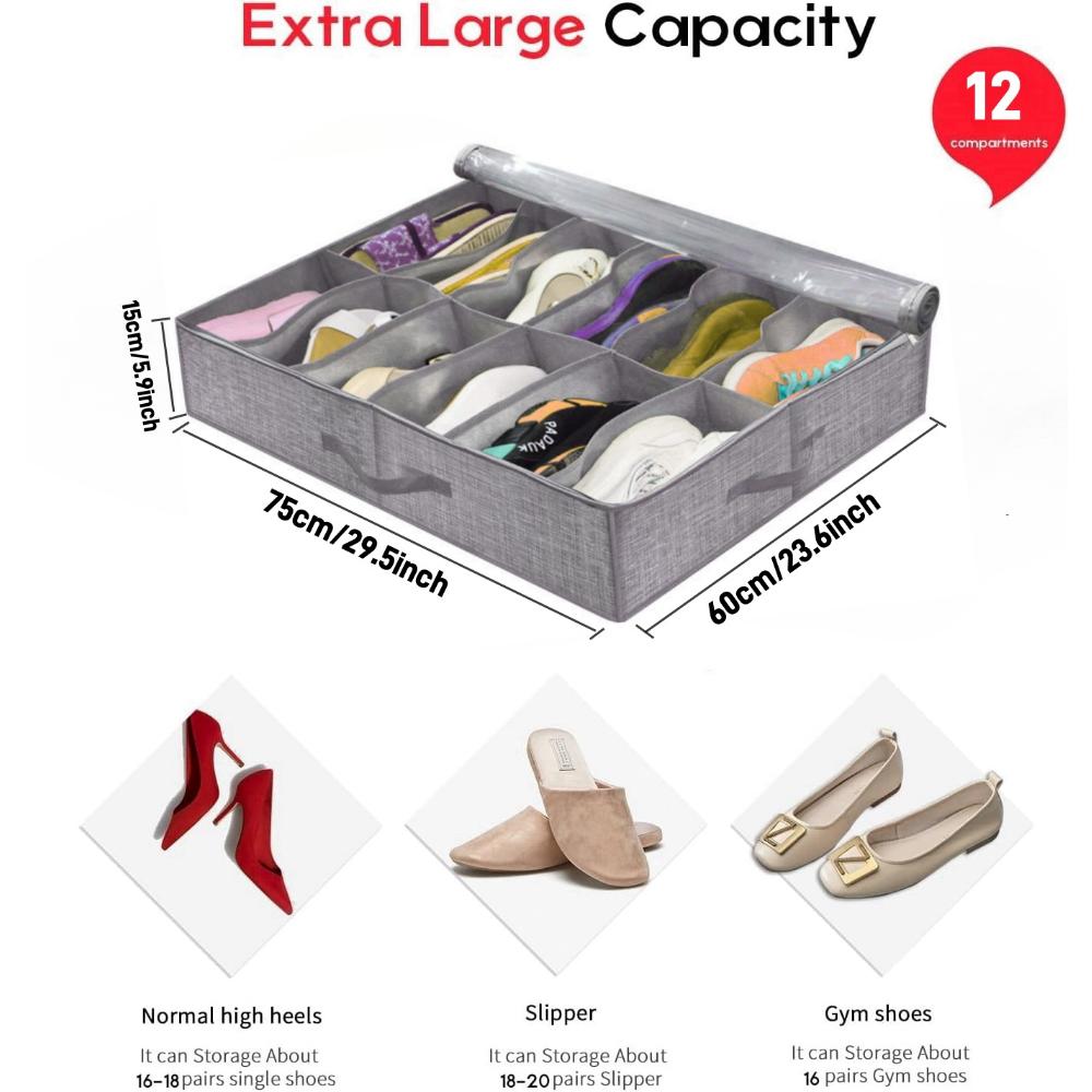 Shoe Storage Organizer box for Under Bed, Fit 12 Pairs, Collapsible Closet Underbed Shoes Container Bags with Reinforced Handles