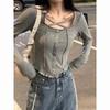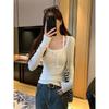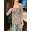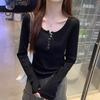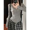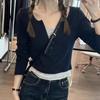 Irregular Button Design Fake Two-piece Threaded Long-sleeved T-shirt Bottoming Shirt for Women Scheming V-neck Short Top