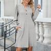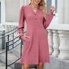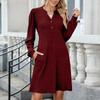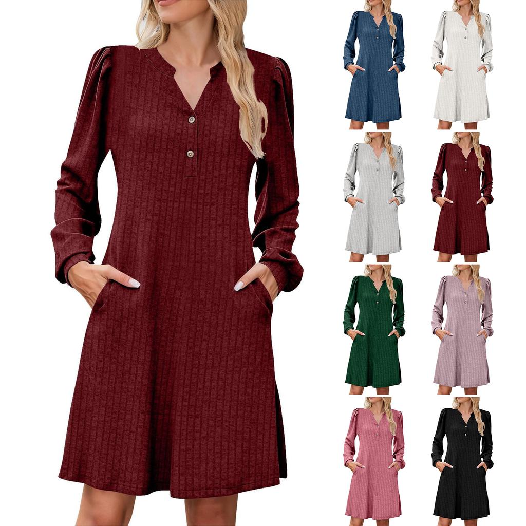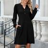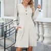 Women's Casual Fashion -color V-neck Brushed Ribbed Button Pocket A-line Long-sleeved Dress