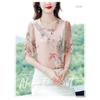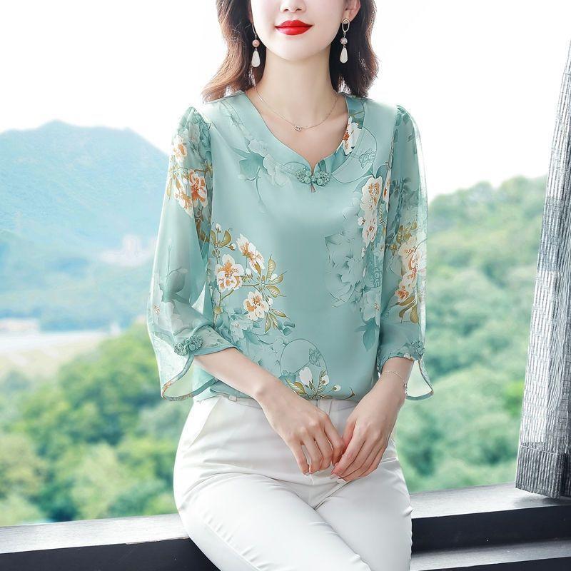 Dámská mátově zelená šifonová halenka s květinovým potiskem, poloviční rukáv, čínský styl, výstřih do V, ležérní top