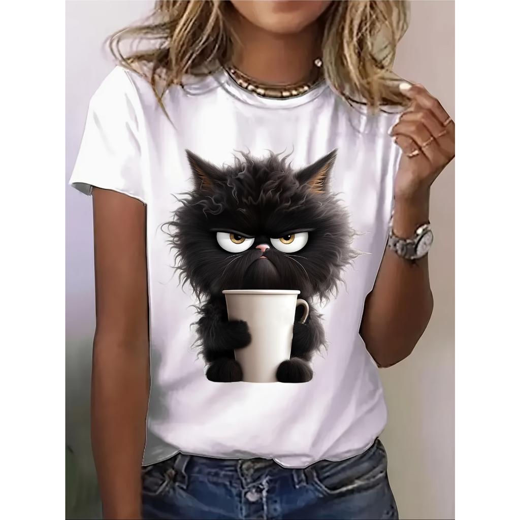 Spring and Summer Short-Sleeve T-Shirt for Women with A Cat Print