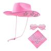 This stylish hat scarf glasses set offers a complete western-inspired look perfect for carnivals, theme parties, and dress-up events. The set includes a classic pink felt cowboy hat featuring a soft feather lining for comfortable wear and versatile styling.