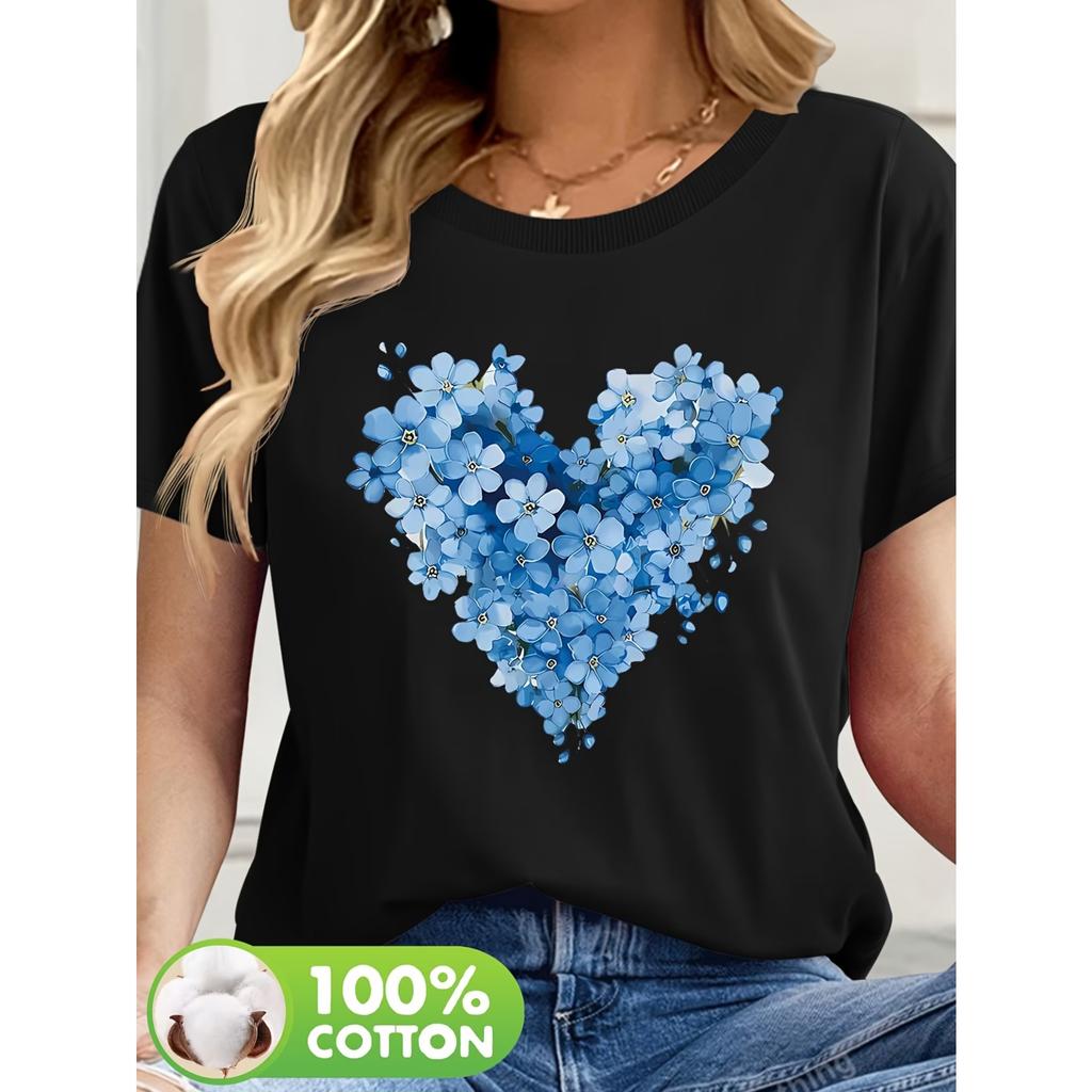 Women'S Heart Print T-Shirt - Blue Floral Design, Casual Round Neck Short Sleeve Tee, Breathable & Machine Washable for Spring/Summer