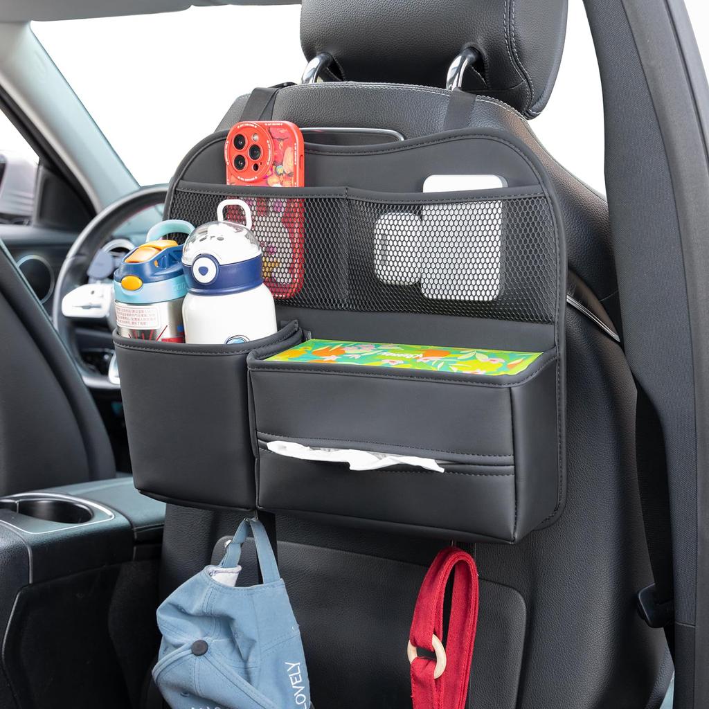 Sancaral Leather Car Seatback Pocket for Rear Includes Drink Tissue and Headrest Mountable for Travel Storage Seats, Holder, Box, Hooks, In-Car