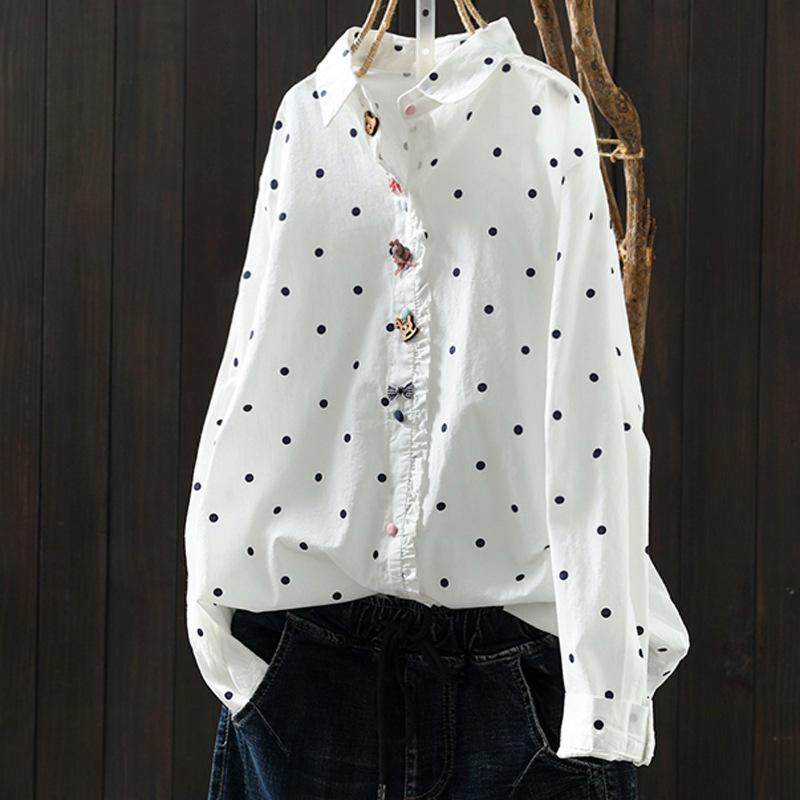 Korean Style Clothes Women Spring Cotton White Polka Dot Print Shirts Long Sleeve Blouses Middle-aged Women's Clothing