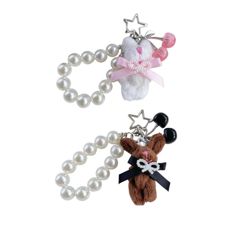Adorable plush rabbits cherries pendant keychain with faux pearls combines whimsical charm and duals functionality as a stylish phone charm or practical key organiser.