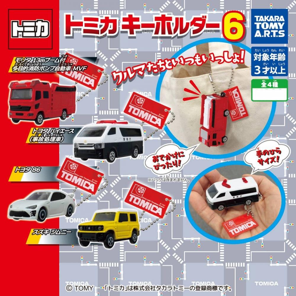Tomica Keychain 6: 1Box (8pcs) is a figure trading kit featuring various vehicle models included at random. This keychain is a small-sized mascot that can be attached to bags or keys for use.