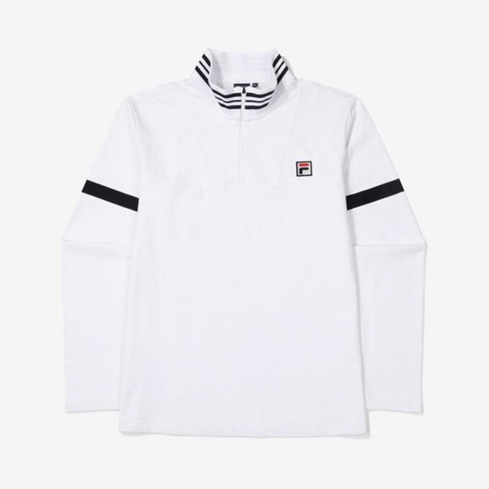 The FILA Half-Zip Fleece Long Sleeve T-Shirt is a men's sports t-shirt made with fleece fabric that keeps you warm during mid-season to early winter. The half-zip design allows for flexible styling, and the soft touch and moisture-wicking functionality provide comfort during workouts. The color is OFFWHITE.