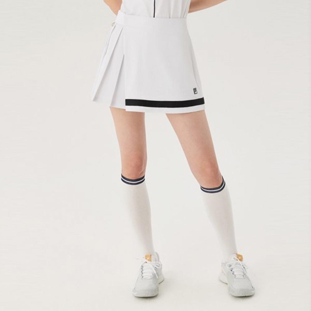 The FILA Functional Half-and-Half Pleated Skirt is a women's skirt that combines a stylish design with functionality. The outer fabric is made of elastic polyester blend for excellent comfort, while the inner shorts are made of breathable polyester providing comfort. It comes in Linen color and is designed for outdoor activities.