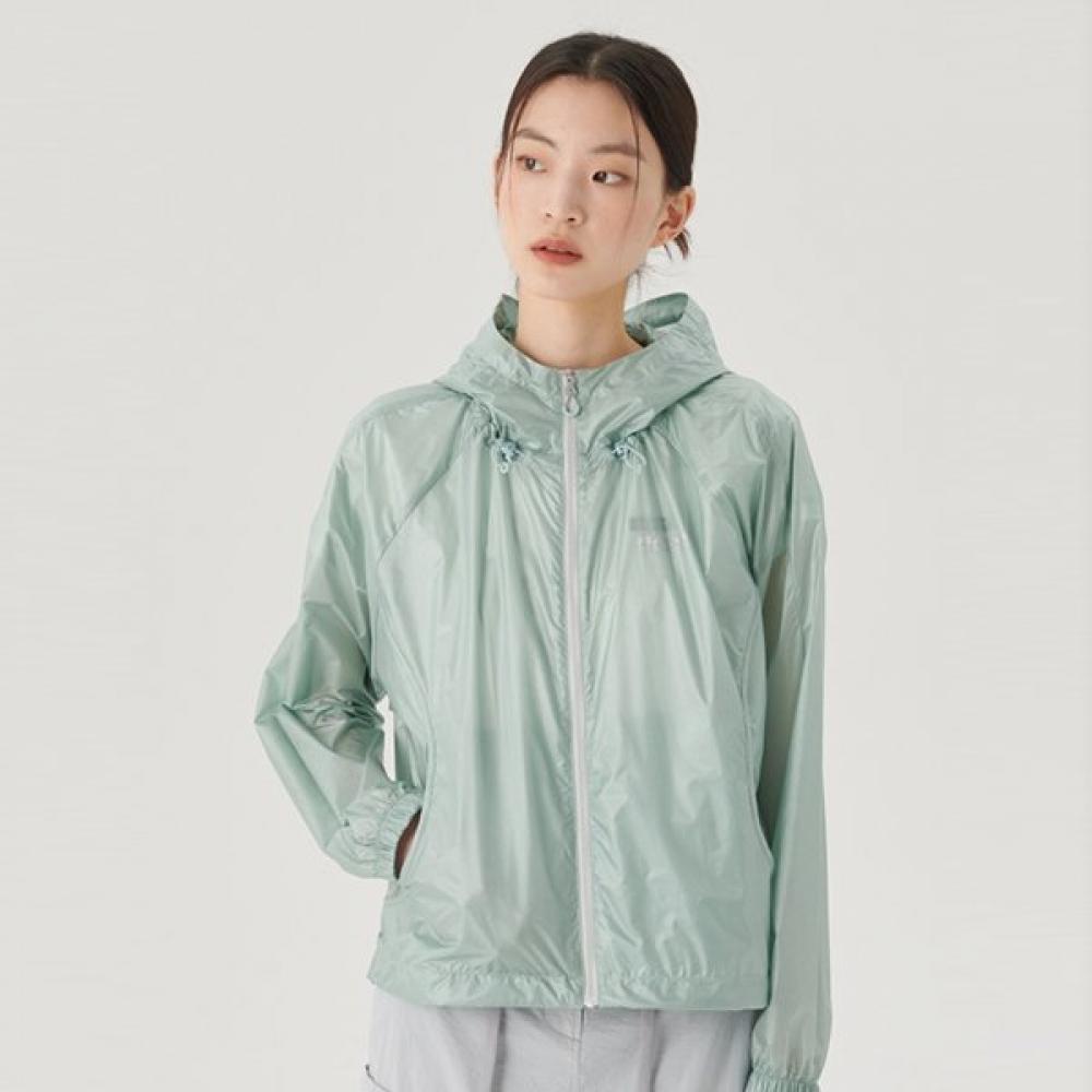 The FILA Pertex Hood Windbreaker is a lightweight women's hiking jacket made from Pertex material. It features windproof capabilities and is suitable for cold and windy weather. The back has a ventilation function for effective sweat evaporation. The hood design protects the wearer's head, and the style resembles nylon/coach jackets offering versatile use. The color is Silver.