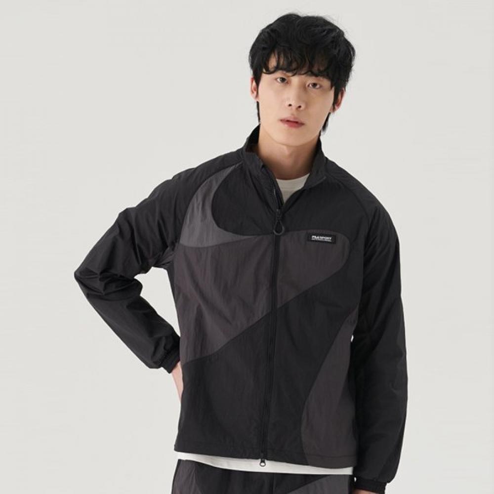 The FILA Crinkle Curved Cut Windbreaker is a men's sports jacket featuring a curved cut design with a goofcore mood and a comfortable fit. Made from functional nylon material, it effectively blocks wind and maintains comfort even when sweating. The sleeves are adjustable with Velcro, and the hood detail and hem string allow for fit adjustments. It can be matched with shorts of the same material as a set.