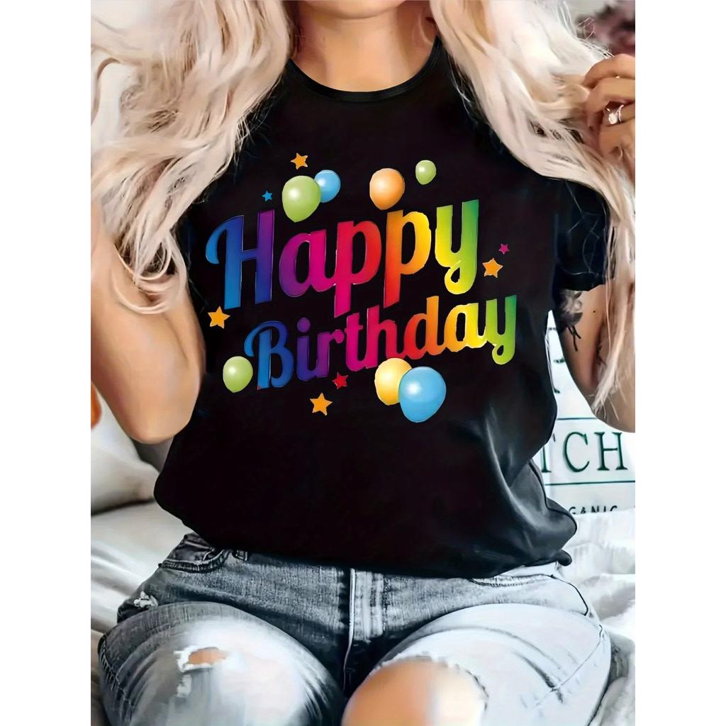 Women'S "Happy Birthday" Graphic T-Shirt - Black Casual Crew Neck Short Sleeve Top with Colorful Balloon Design, Perfect for Spring & Summer