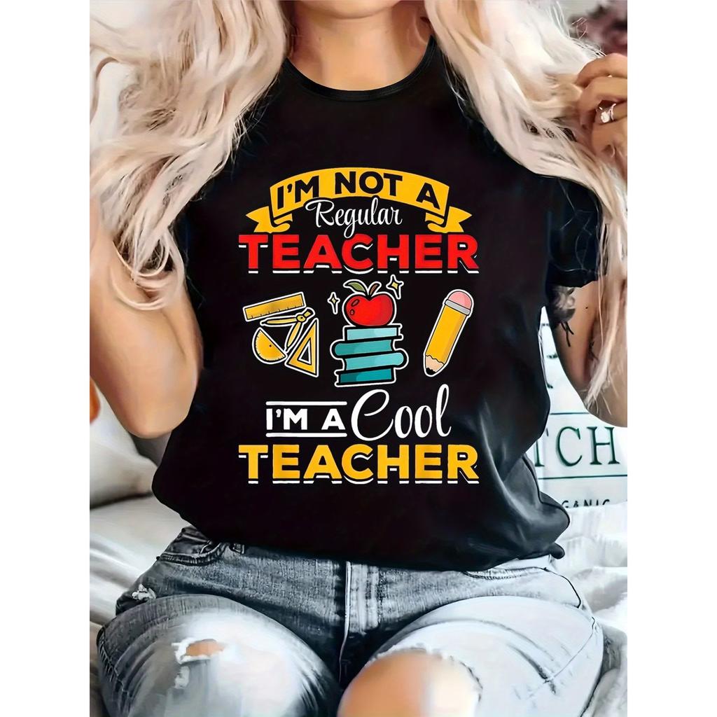 Women'S Casual T-Shirt - "I'm Not A Regular Teacher, I'm A Cool Teacher" Graphic, Black with Colorful Illustrations, Short Sleeve