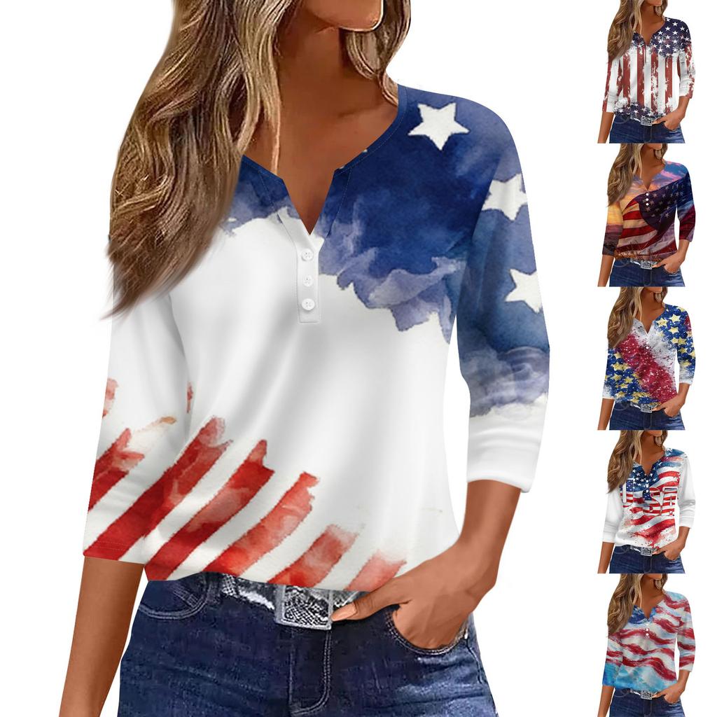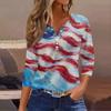 Women's Fashion Casual Independence Day American Flag Stars and Stripes Print Collar V-Neck Three-Quarter Sleeve Decorative Button-Up T-Shirt Top