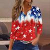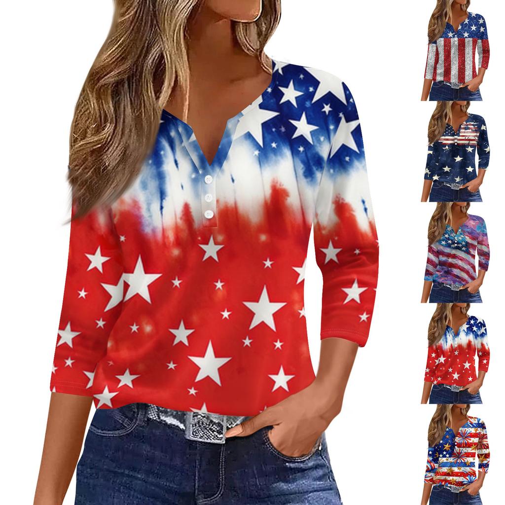 Women's Fashion Casual Independence Day American Flag Stars and Stripes Print Collar V-Neck Three-Quarter Sleeve Decorative Button-Up T-Shirt Top