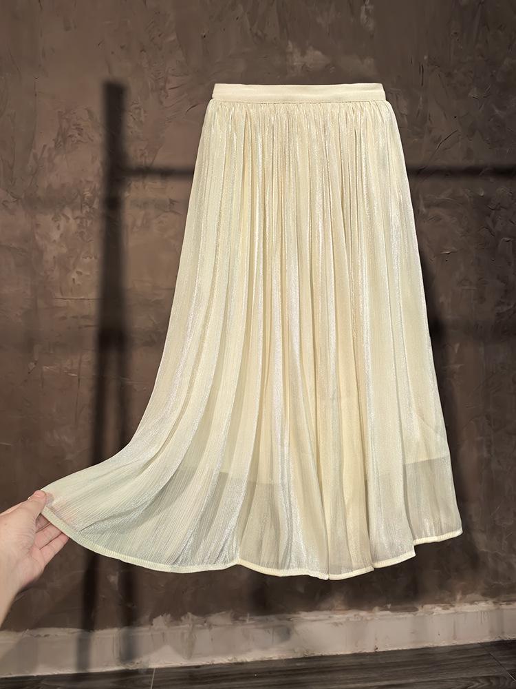 Champagne High Waist Seamless A-Line Gauze Skirt for Women - Versatile Mid-Length for Spring, Summer, and Autumn.