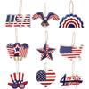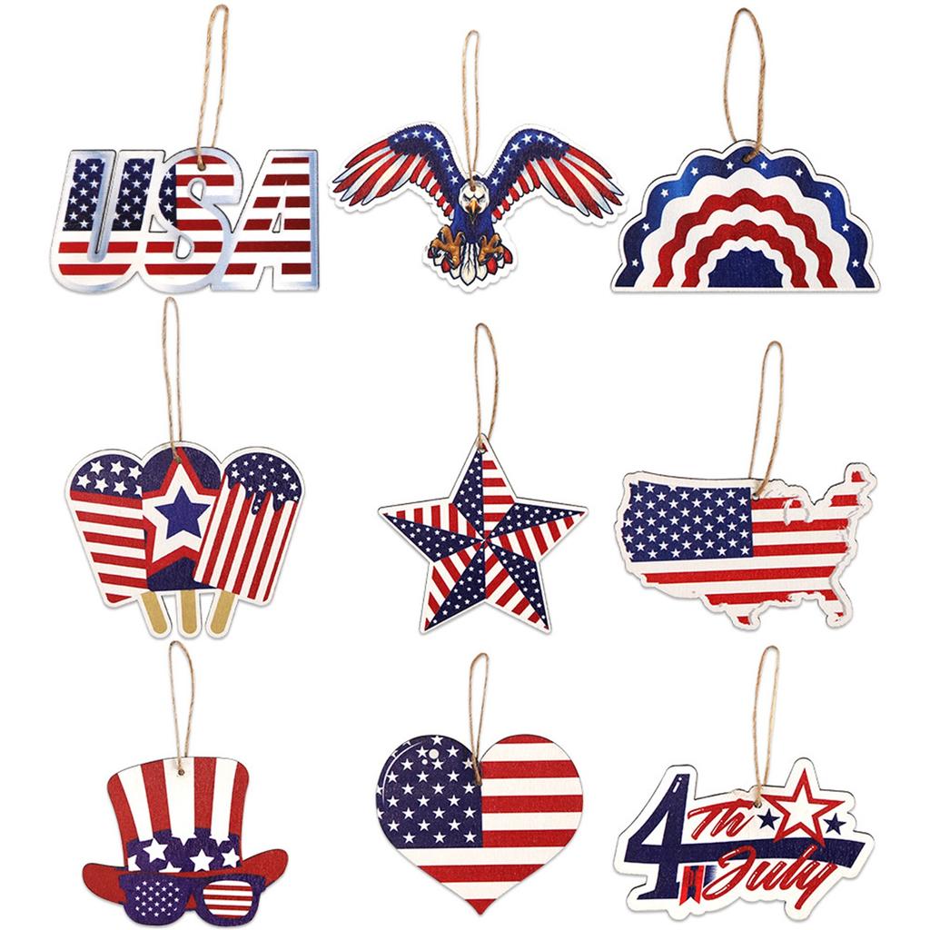 The entire design is centered around Independence Day in the United States, featuring classic elements such as USA, stars, , , hearts, and hats. The designs are and , with a unified red, , and blue flag color scheme, creating a strong festive atmosphere and high . Made of high-quality thickened wooden boards, the texture is hard and not easily deformed. The surface adopts high-definition color printing technology, with clear and bright patterns and firm colors. The edges are polished smooth without burrs, and the overall texture is thick and delicate. Each model is equipped with a natural hemp rope hanging rope, which is securely fastened and easy to hang. It can be directly hung Christmas trees, door curtains, branches, walls, flower garlands, etc. It is easy to install and suitable for various hanging scenarios. The overall is American retro , with wooden textures paired with holiday prints, combining natural texture and patriotic theme decoration effect. It is compact and exquisite, with strong three-dimensional effect after hanging, beautiful and . Suitable for Independence Day, Day parties, home decor, shop , yard decoration, holiday gifts and other scenes in the United States. It can be hung separately or combined to easily create a lively holiday atmosphere. Includes: 9 * pendants