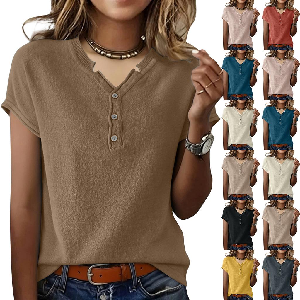 Women's V-neck Loose Button Placket Short Sleeve T-shirt