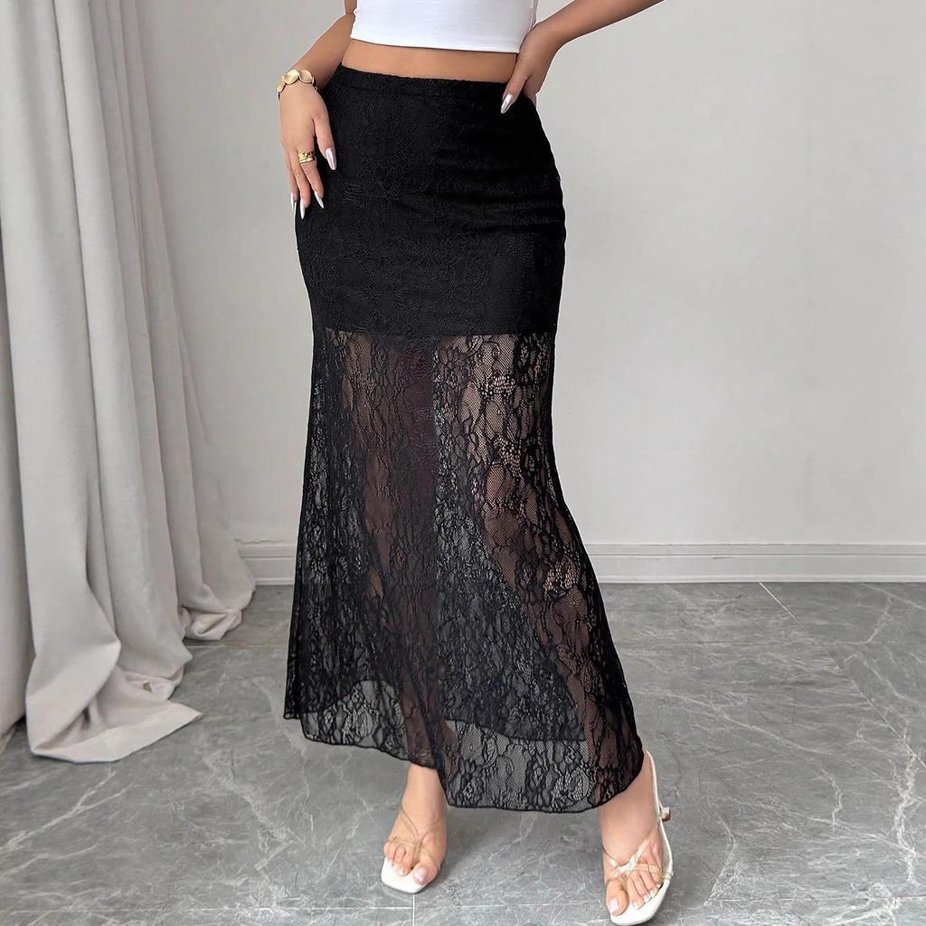 Introducing a chic and stylish women's long skirt that effortlessly captures the essence of European and American spring/summer fashion. This elegant black lace skirt features a see-through design with intricate floral embroidery, adding a touch of sophistication to any outfit. Made from high-quality polyester fiber, it offers a slimming fit that is both comfortable and flattering. Whether for a casual day out or an evening event, this skirt is the perfect addition to your wardrobe.