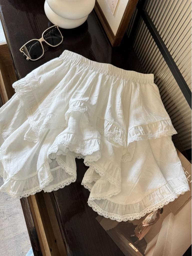 2026 New Irregular White Lace Trim Patchwork Cake Skirt: High Waist, Fluffy, Short Women's Skirt