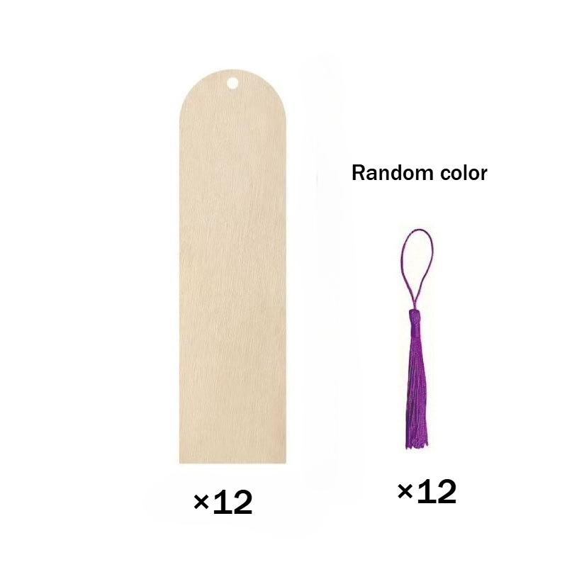 12pcs Unfinished Wooden Bookmark DIY Wood Craft Bookmarks with Laser Cut Wooden Hooks, Square Tags, 12 Tassels - Random Color