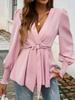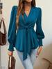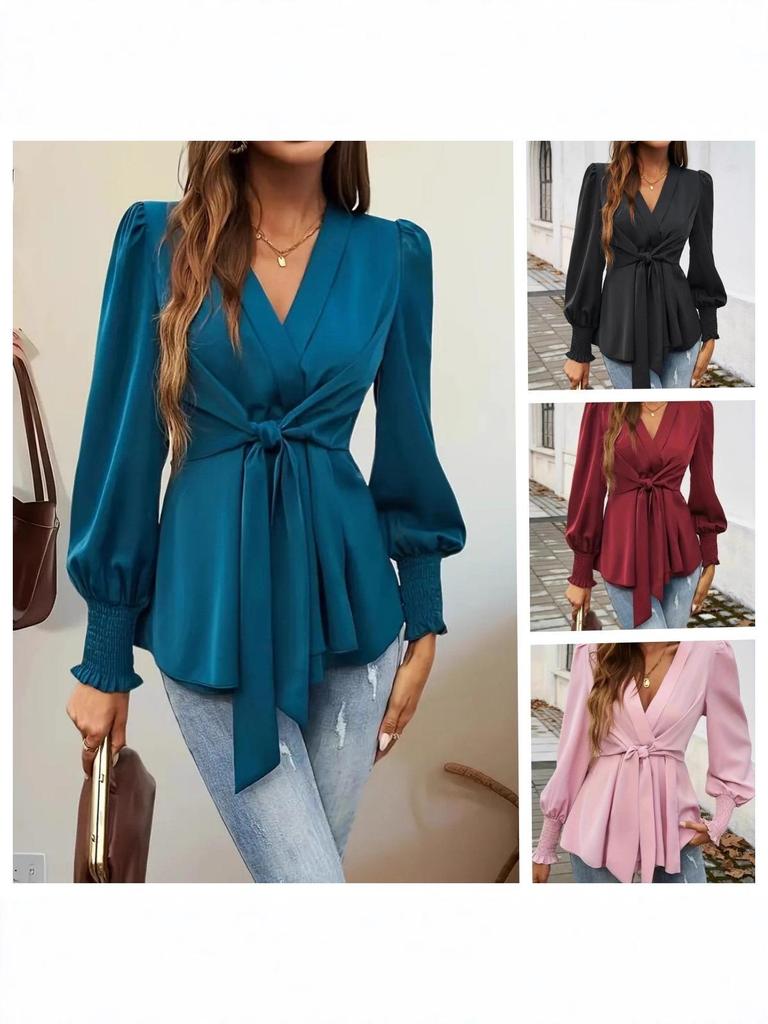 This elegant women's shirt is designed for the 2026 autumn season, showcasing a sophisticated V-neck and long sleeves that offer a sleek silhouette. The shirt features a lace-up detail at the waist, providing a flattering, cinched look. Made from high-quality polyester, its solid color adds versatility, making it ideal for both casual and formal occasions. The refined design elevates any outfit with a touch of chic style.