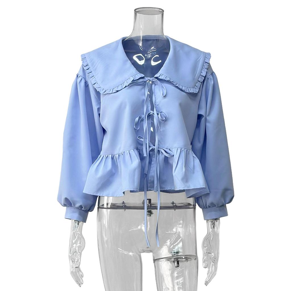 2026 Spring Fashion: Women's Long Sleeve Cotton Shirt with Doll Collar and Tie-up Design - European & American Style
