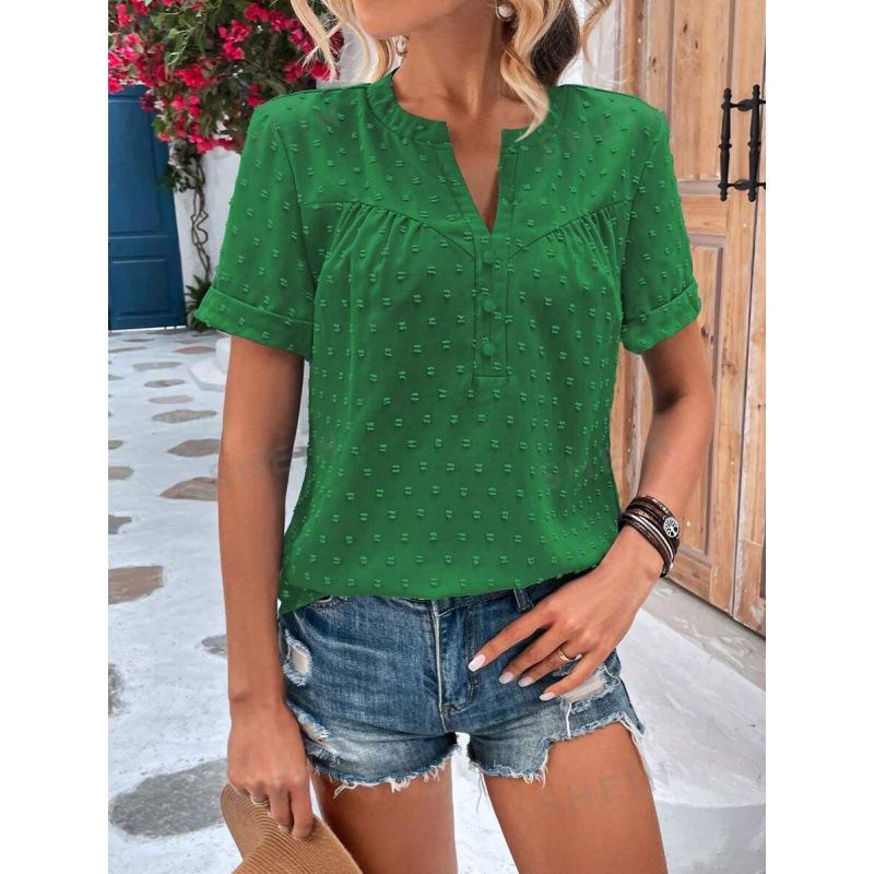 Elevate your office attire with this elegant V-neck jacquard shirt, designed exclusively for women who appreciate style and comfort in their daily commute. Crafted from high-quality polyester material, this solid color top offers a sophisticated look with its delicate jacquard pattern. The short sleeves and classic V-neckline make it a versatile piece for any wardrobe, perfect for transitioning seamlessly from the workplace to after-hours engagements. Experience the perfect blend of style and practicality with this chic and professional addition to your closet.