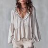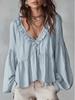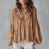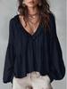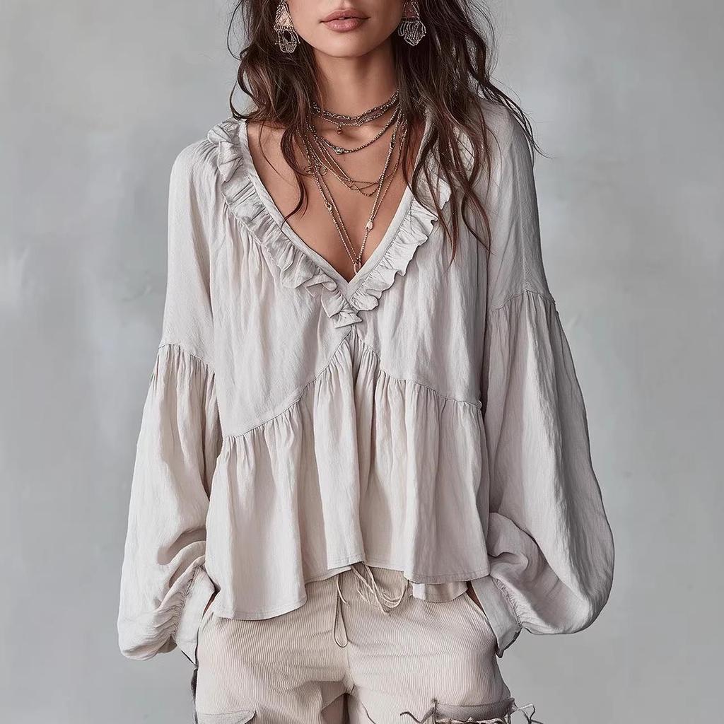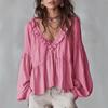 Elevate your warm-weather wardrobe with this stylish casual top, featuring elegant ruffle puff sleeves and delicate pleating. Crafted from high-quality polyester, it ensures comfort and breathability throughout the day. The solid pattern design adds a touch of sophistication, while the long sleeves and v-neck neckline create a flattering silhouette. Perfect for both European and American styles, this top effortlessly combines charm and versatility for any occasion.
