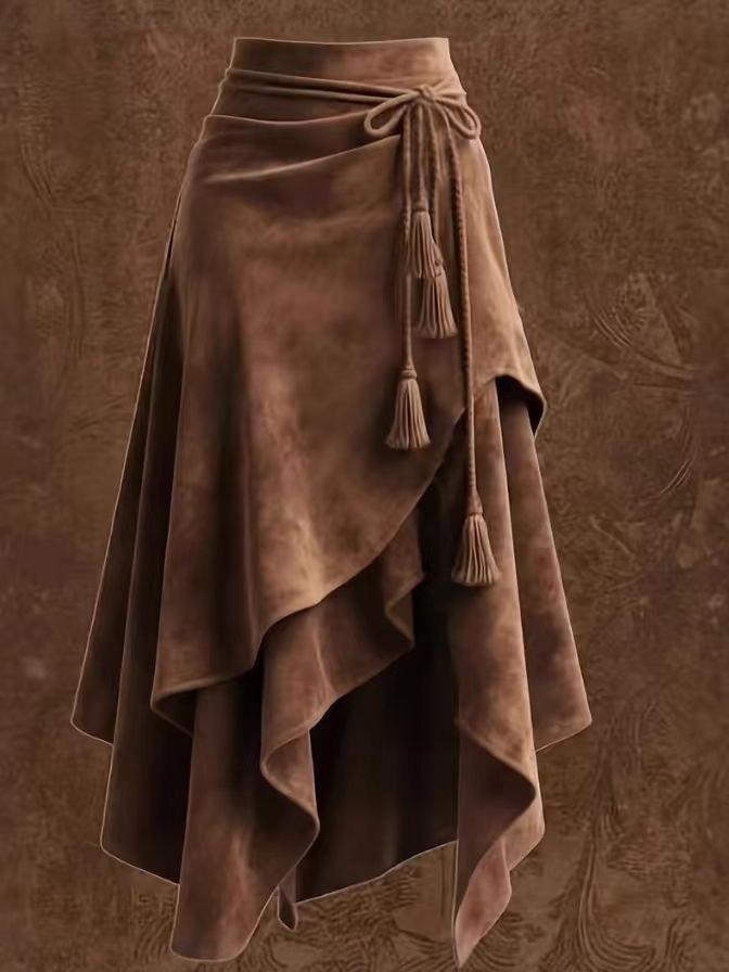 Women's 2025 Coffee Suede Half Skirt: Autumn Irregular Lace-up Slimming A-line Mid-length
