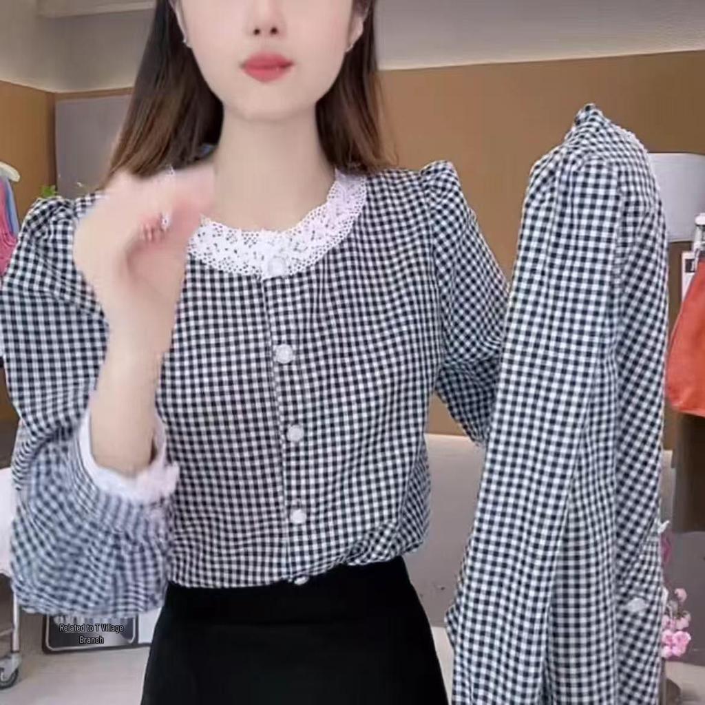 2026 Women's French Retro Plaid Lace Blouse - Long Sleeve Round Neck