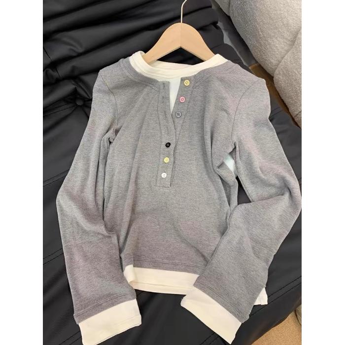 Plus Size V-Neck Long Sleeve Layered T-Shirt - Slimming, Colorful, Buttoned Top for Women